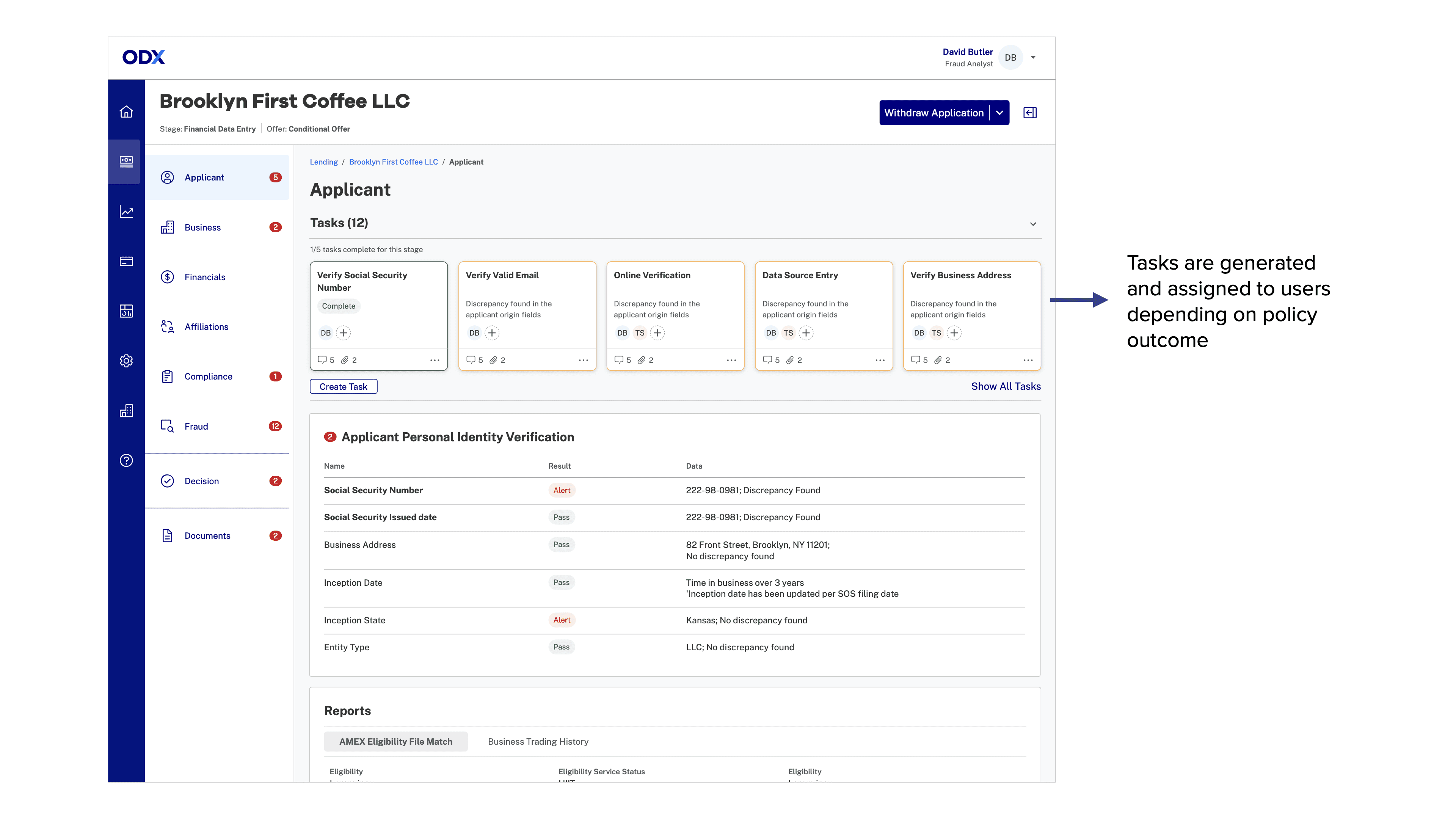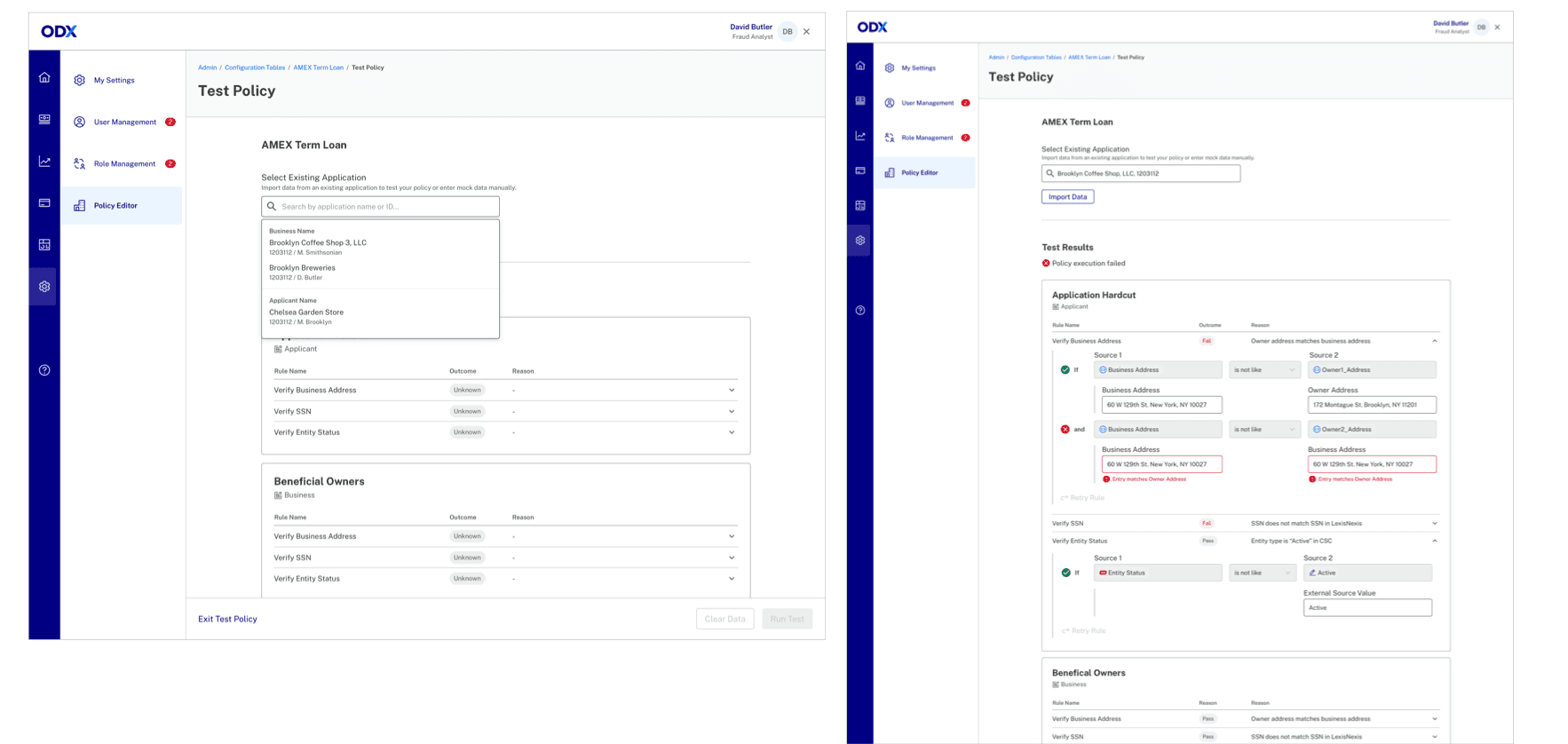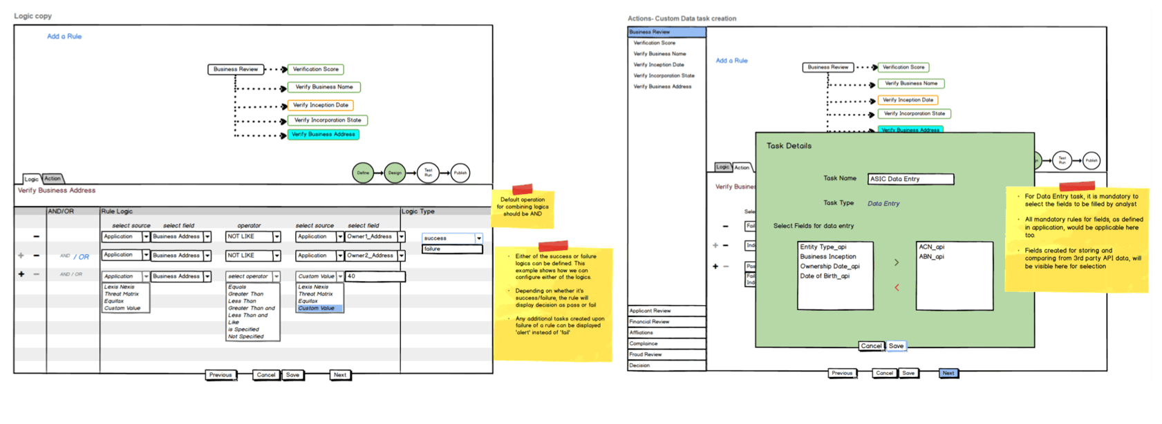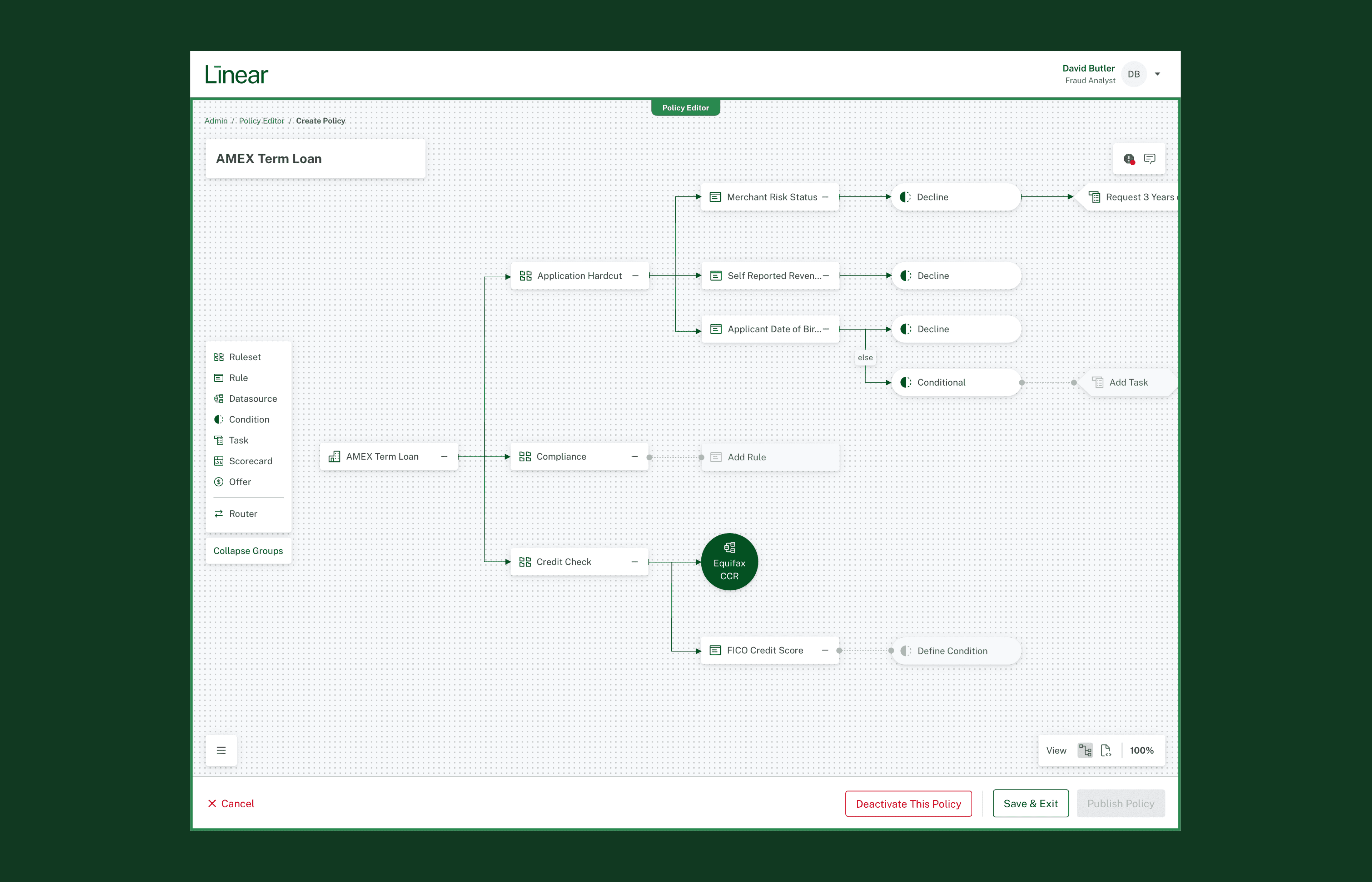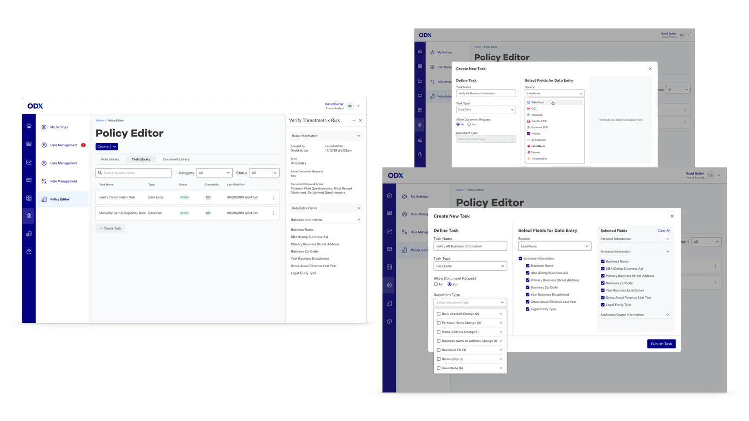 Bank partners needed clear visibility into pass/fail criteria, with failed or indeterminate outcomes automatically generating tasks for manual review—ensuring applications could continue through the workflow.All internal implementation managers can build a simple policy end-to-end