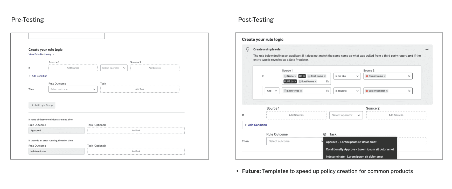 Before publishing, users could test policies using real application data or mock inputs. The system ran the logic and surfaced different outcome scenarios, helping users validate accuracy with confidence.
