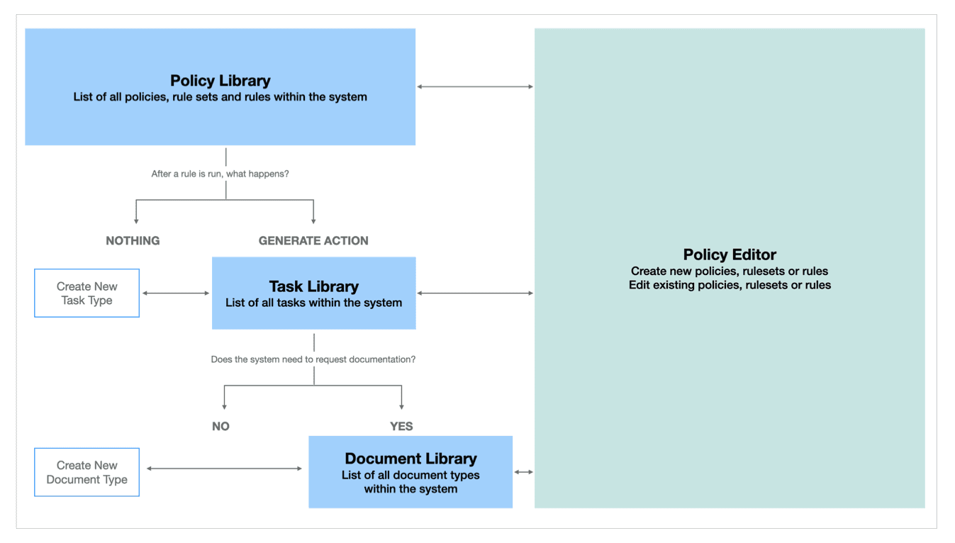 Policies existed across multiple levels. We organized content using familiar card and table patterns, with tabs allowing quick lateral movement between the Rule, Task, and Document libraries.