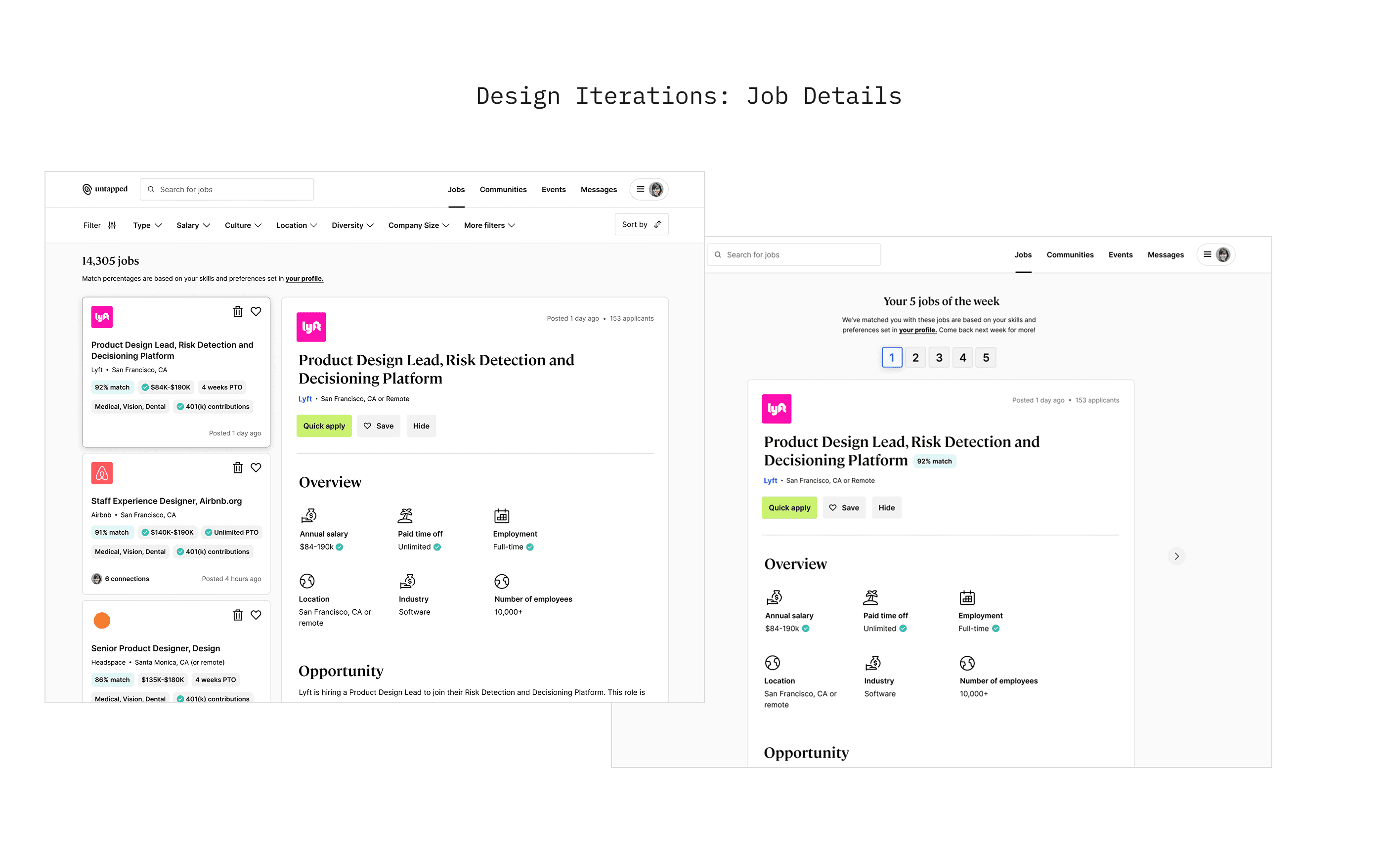 Post-MVP, we continued research and testing to refine data hierarchy, fill content gaps, and create a more engaging, data-driven job discovery experience.